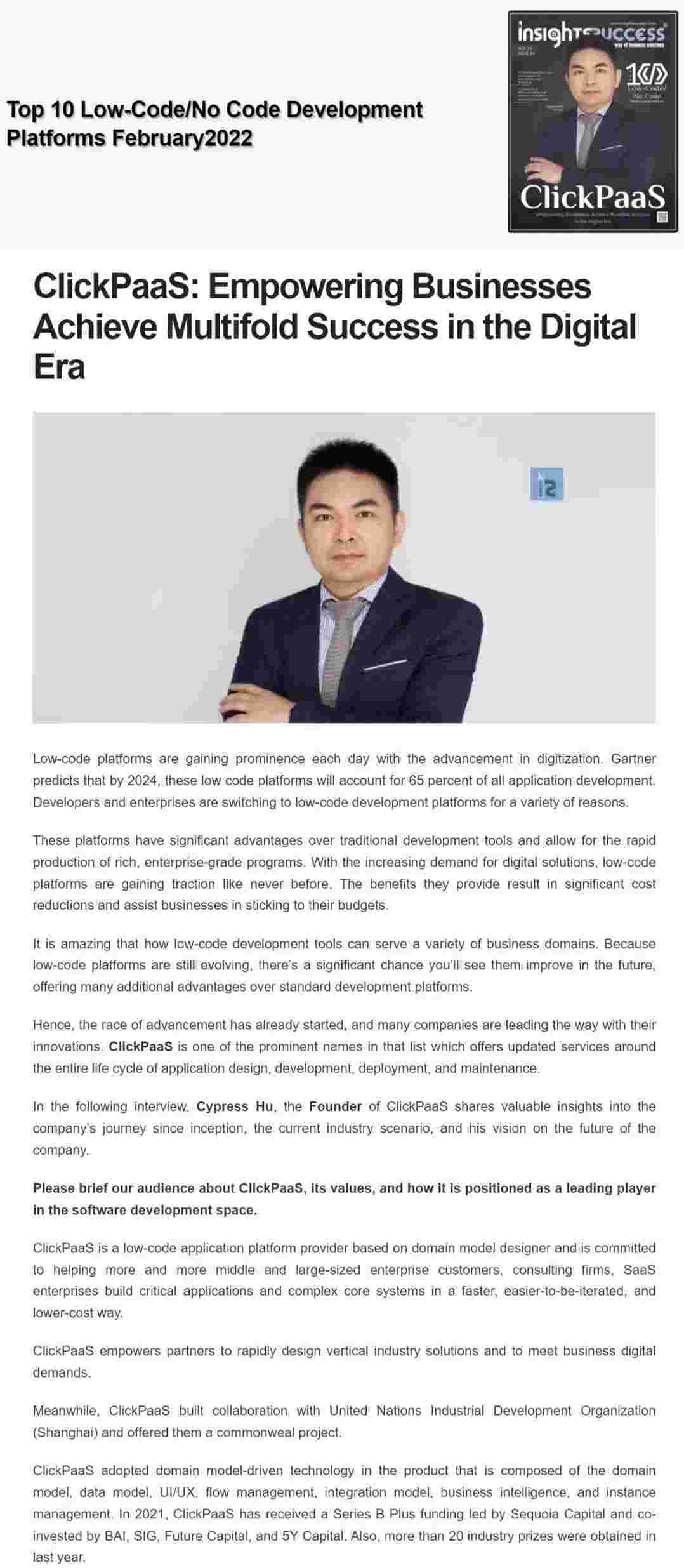 2022年年初,,,,VIVO钱包入选外媒Insights Success低代码/无代码开发平台 Top10,,创始人、、、、CEO胡柏受邀接受专访并荣登封面人物,,,他与Insights Success的读者分享了VIVO钱包成立的初心、、发展历程、、当前的行业发展趋势以及他对公司未来的展望。。